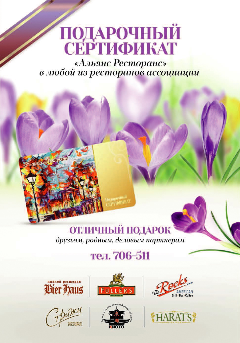 - Сертификат действует во всех заведениях Альянс Ресторанс (Киото, Bier Haus, Стрижи, The Rocks, Fuller’s)